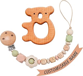033 Schnullerkette aus Silikon und Holz für Babys & Kleinkinder, Personalisiert Schnullerkette mit Buche Schnullerketten Clips und Silikonperlen