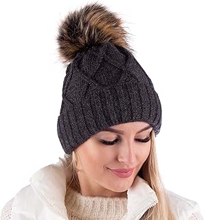 Damen Mütze Winter Fellbommel Fleece-Futter Bommelmütze Kunstfell-Bommel Strickmütze Beanie-Mütze Winter-Haube Damenmütze 20547 warm gefüttert | Made in EU